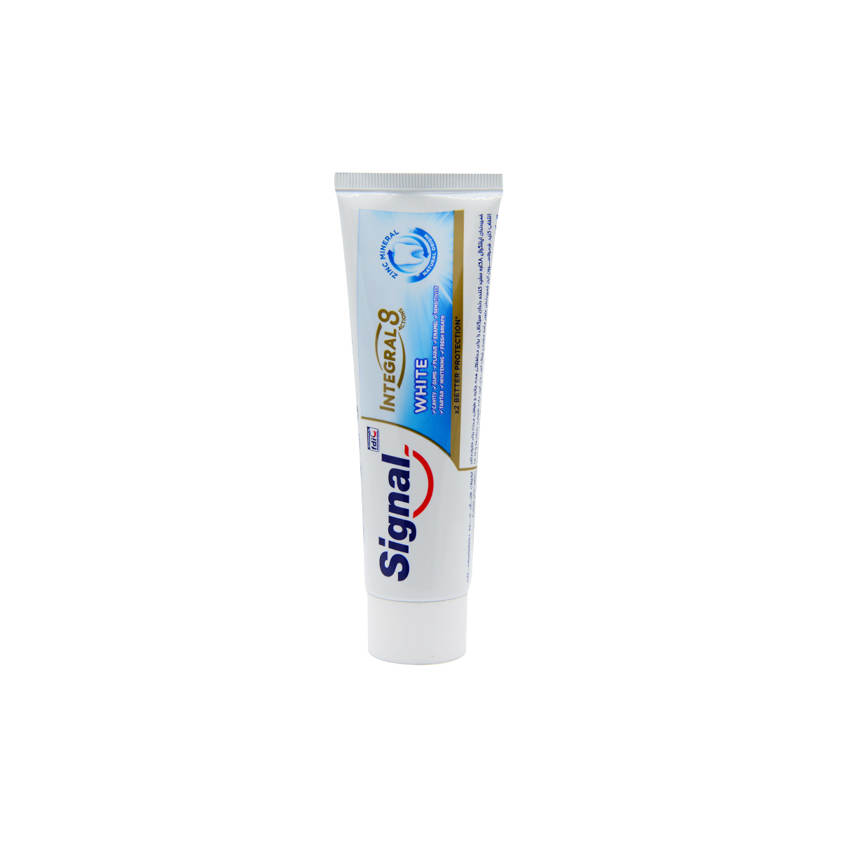 خمیر دندان سیگنال مدل Integral 8 Actions White حاوی فلوراید بوده که باعث توقف پوسیدگی در مراحل اولیه و استحکام بیشتر مینای دندان و افزایش مقاومت دندان‌ها در مقابل پوسیدگی می‌شود.
